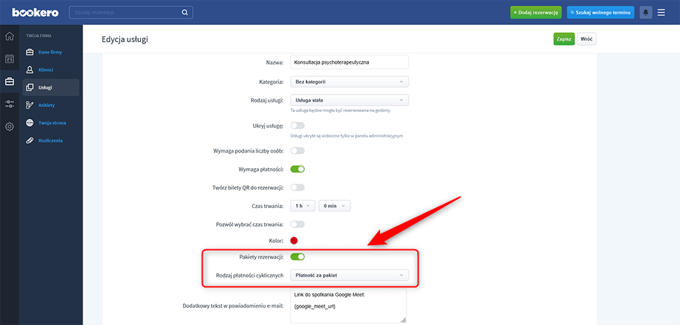 Po aktywacji funkcji w ustawieniach usługi poniżej pojawi się dodatkowa sekcja o nazwie Pakiety rezerwacji.