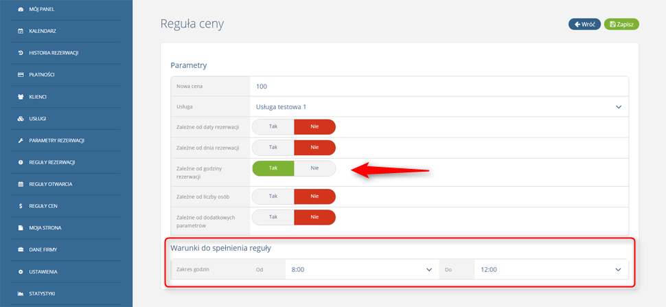 Za pomocą pola Zależne od godziny rezerwacji jesteśmy w stanie określić dokładnie w jakim przedziale godzinowym ma być naliczana niestandardowa cena. Dzięki tej funkcji możemy sobie ustalić dla konkretnej usługi inną cenę w godzinach porannych, a inną w wieczornych.