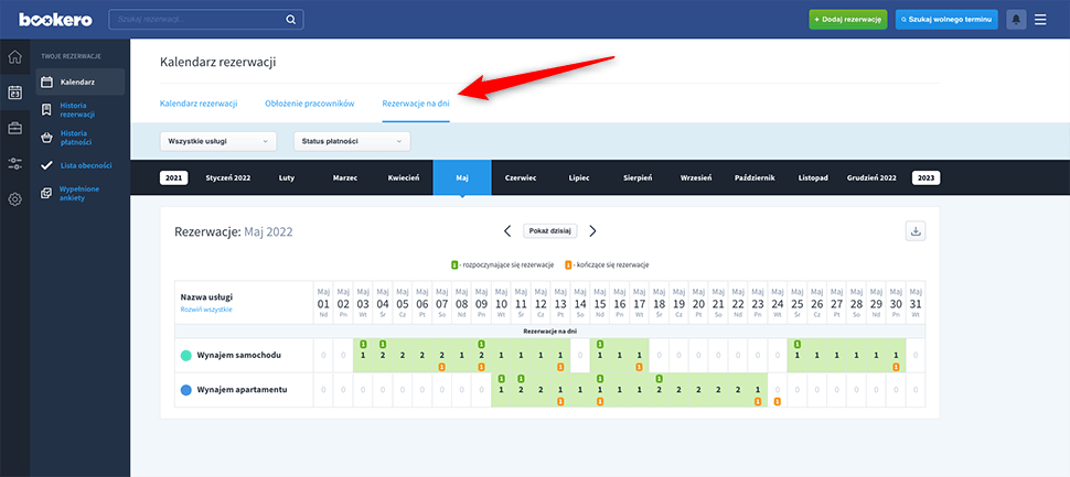 Po włączeniu funkcji w kalendarza rezerwacji pojawi się dodatkowa zakładka Rezerwacje na dni, z dedykowanym widokiem kalendarza.