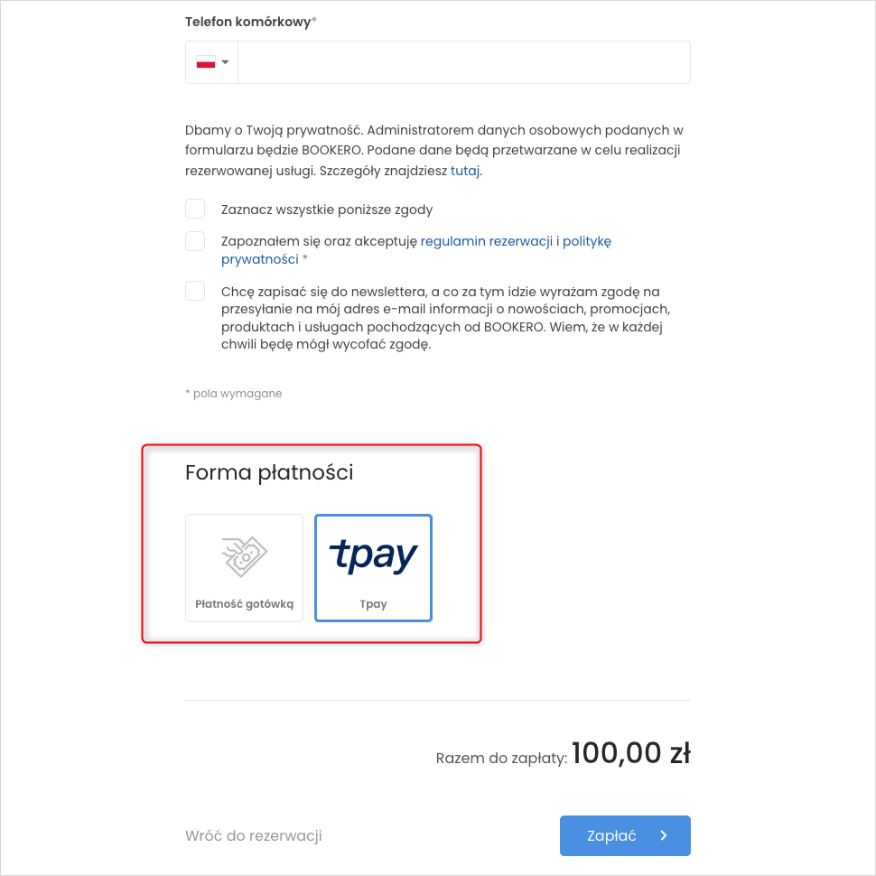 Jeśli dla tej samej usługi ustawimy conajmniej dwie formy płatności wówczas w formularzu rezerwacyjnym pojawi się dodatkowa sekcja Forma płatności.