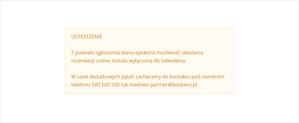 Z powodu ogłoszenia <strong>stanu epidemii</strong> możliwość składania rezerwacji online została wyłączona do odwołania.